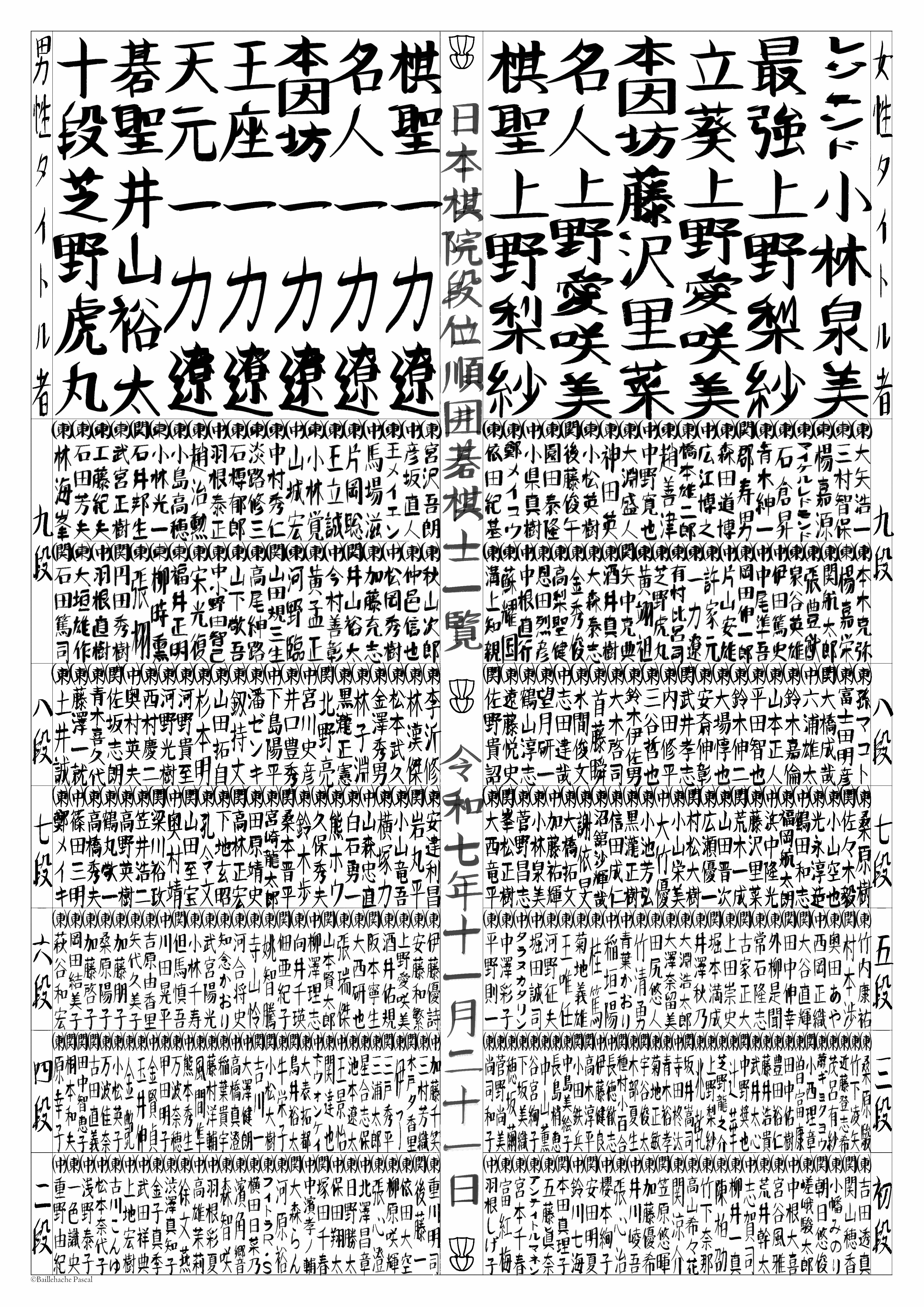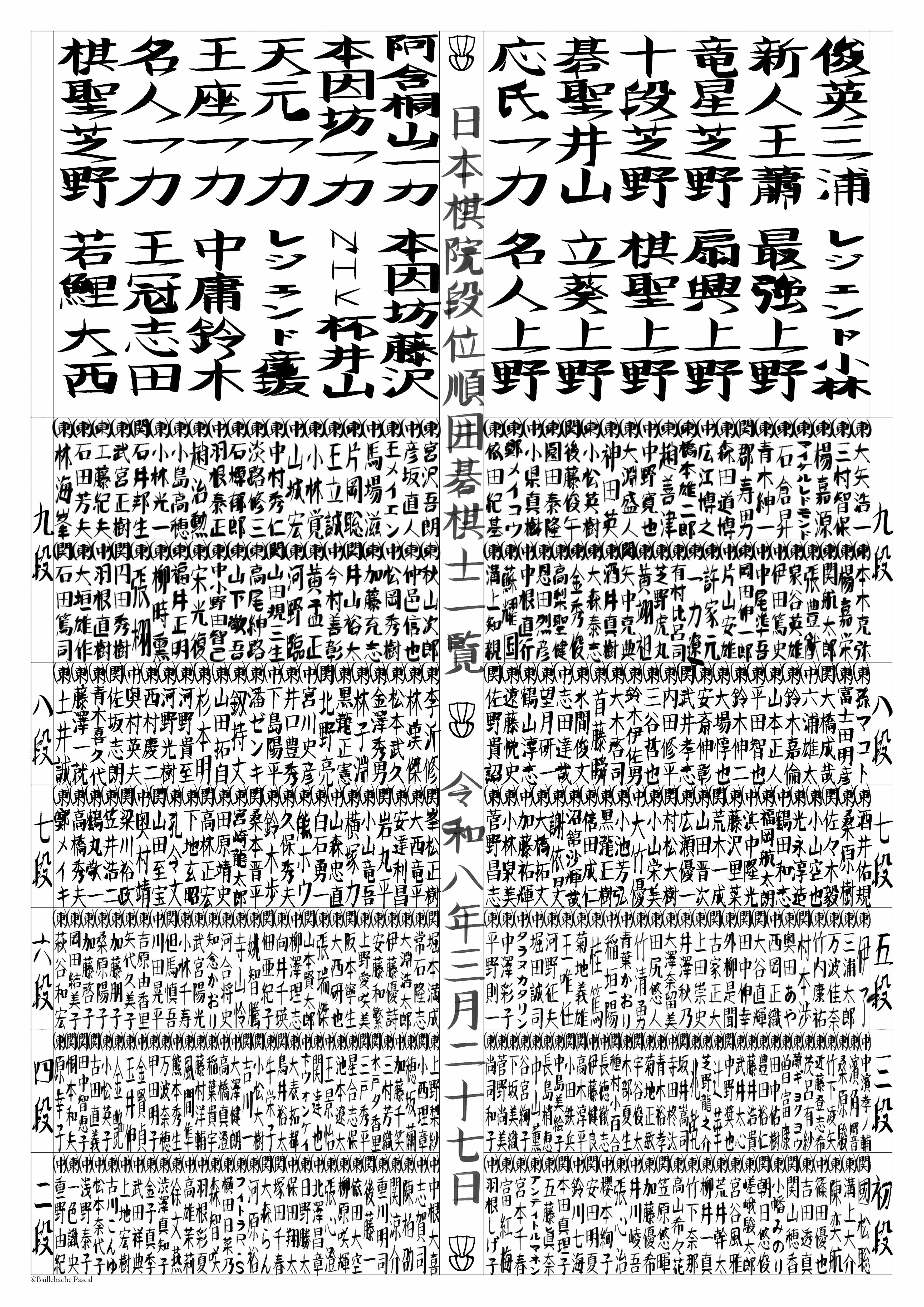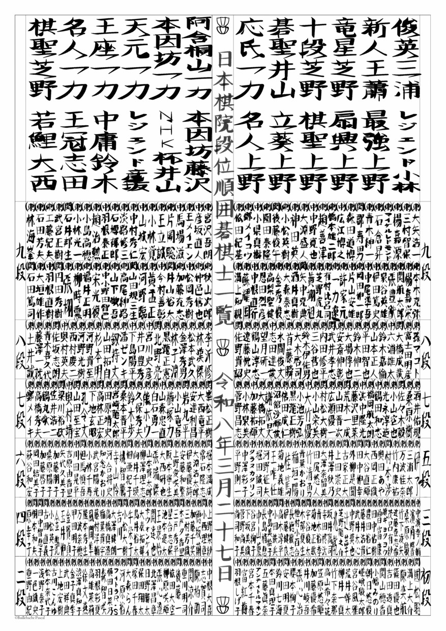 I've used the players information available on the website of the Japanese Federation of Go, and created the design by taking freely inspiration from Sumo's Banzuke. My version has the list of male/female title holders at the top, followed by players' name, grouped by dan, decreasing from top to bottom. There are too many titles to list them all, so I choosed to include only the major ones (棋聖, 名人, 本因坊, 王座, 天元, 碁聖, 十段 for men, and 棋聖, 名人, 本因坊, 立葵, 最強, レジェンド for women). The player's name is preceded by the player's affiliation (東京本院, 関西総本部, 中部総本部). To reflect the rank importance, the sections for 6 dan players and below are half in size compare to the section for 7 dan and 8 dan, which are in turn half in size compare to the section for 9 dan. The calligraphy style also varies with the sections. Within a same dan, players are ordered by their year of accession to that dan. The central column contains the title and date, and is decorated with a motif representing the traditional Go board's feet. The title of each section is written at their edge.