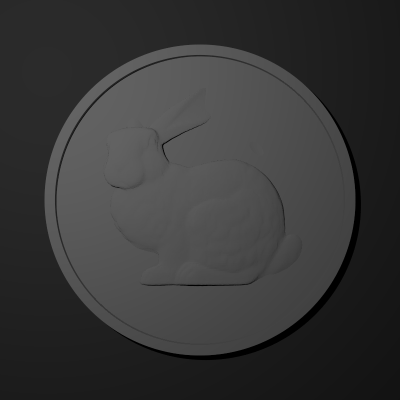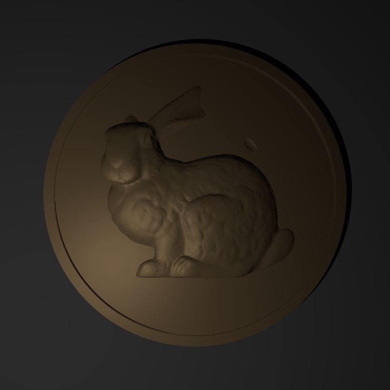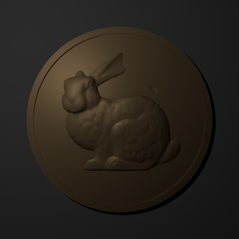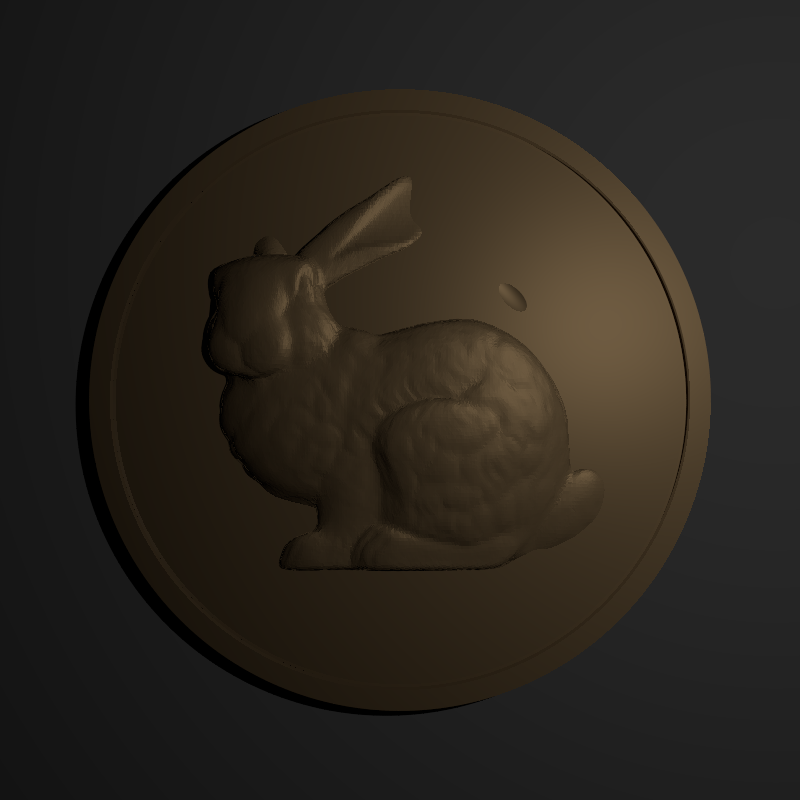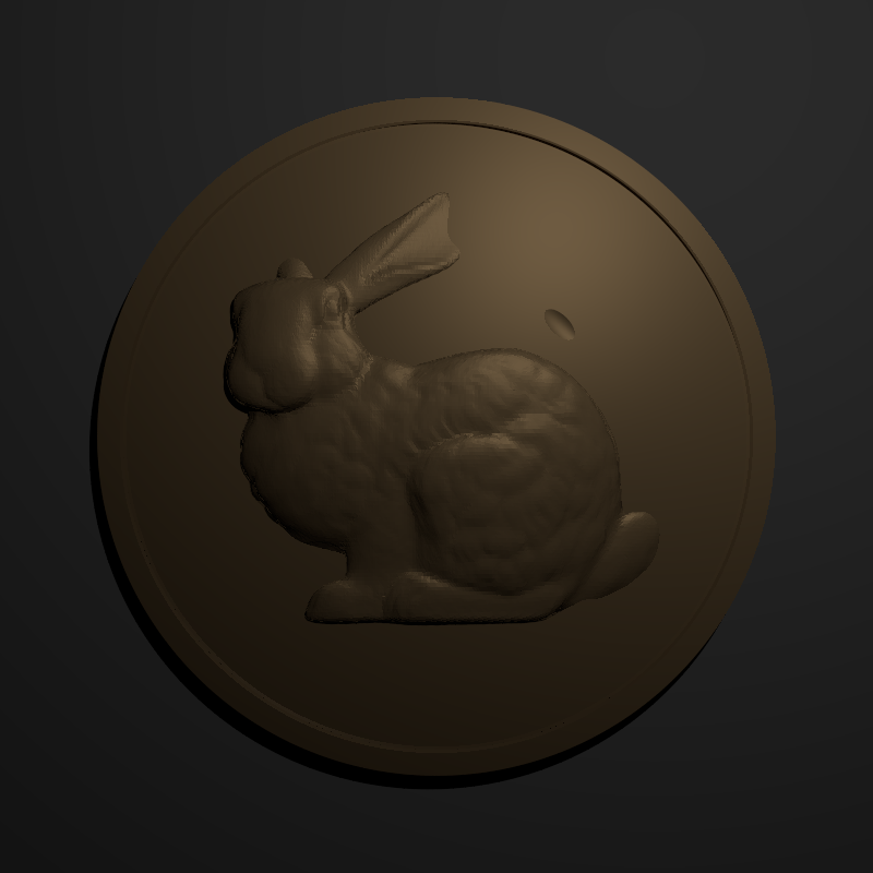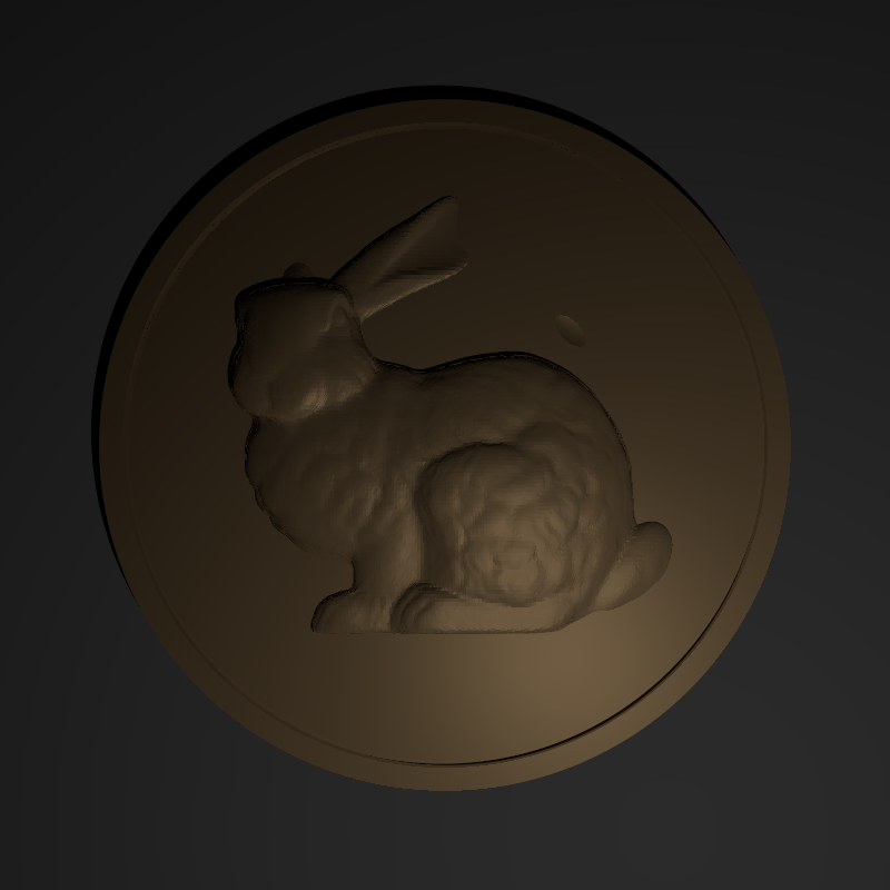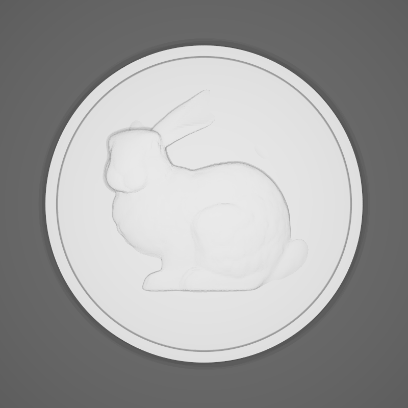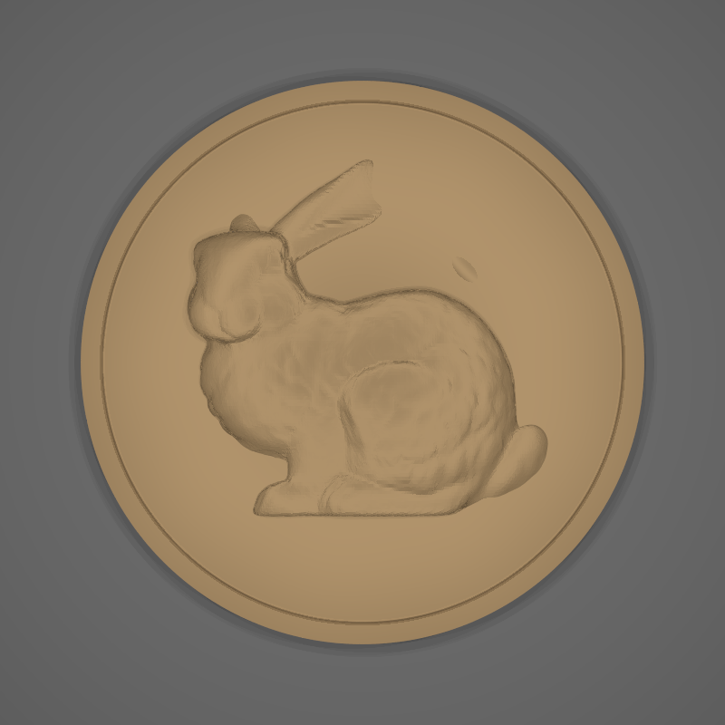 Let's see on some synthetic examples how photometric stereo performs for defect detection. Using again POV-Ray and the Stanford bunny, I've generated a dataset of "Bunny coins" with three textures: matte, metal and wood. The bunny is flatten to the extreme and a slight dent is made on the coin surface near its back.