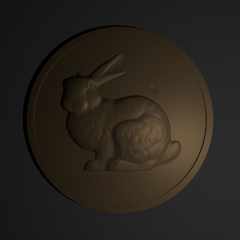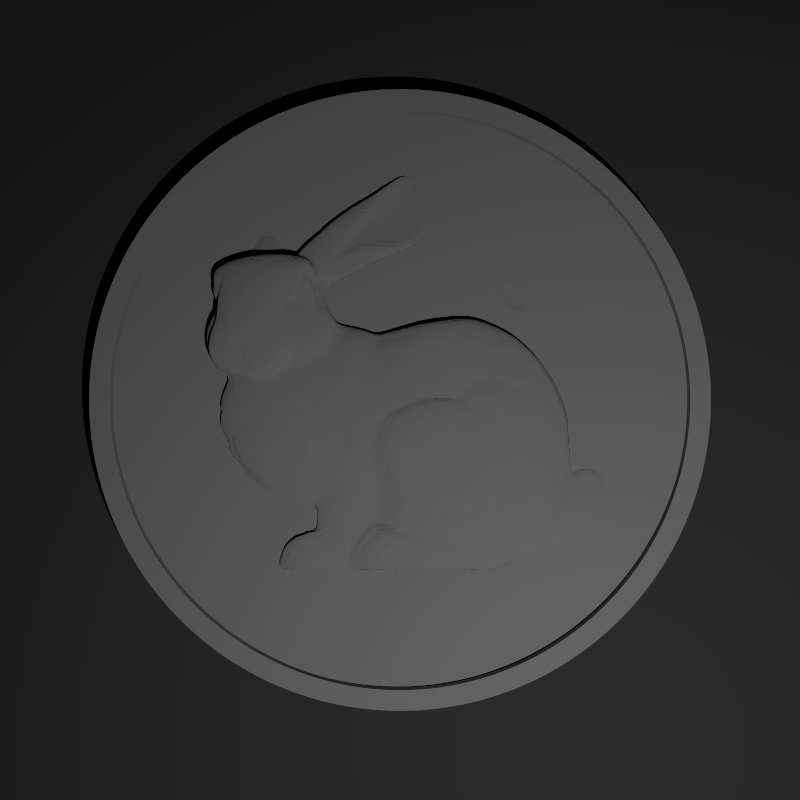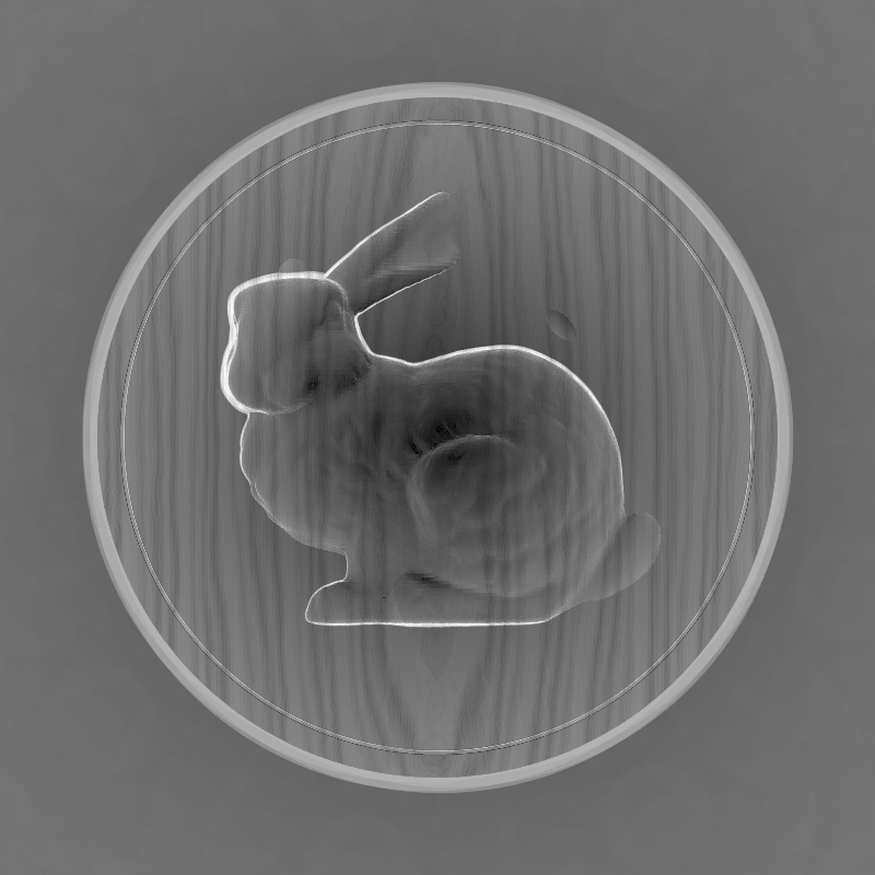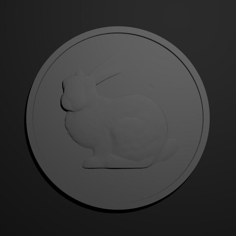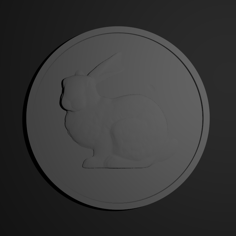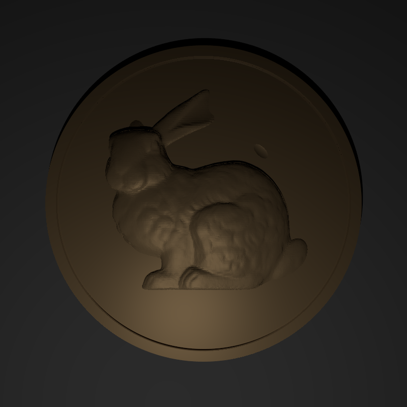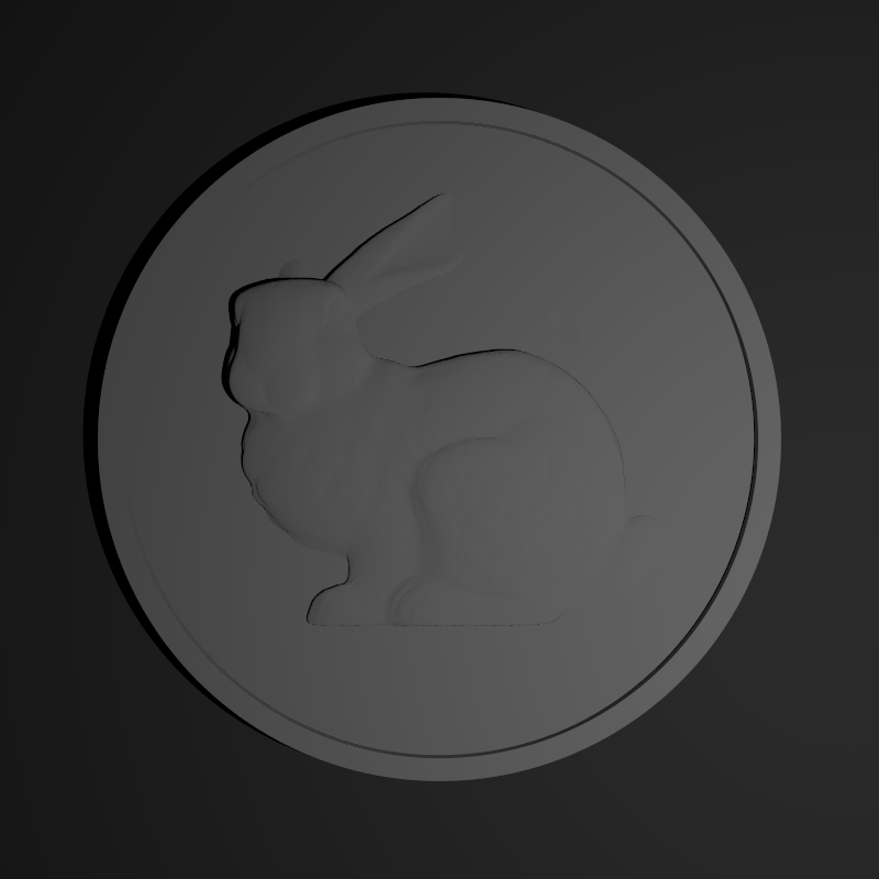 Let's see on some synthetic examples how photometric stereo performs for defect detection. Using again POV-Ray and the Stanford bunny, I've generated a dataset of "Bunny coins" with three textures: matte, metal and wood. The bunny is flatten to the extreme and a slight dent is made on the coin surface near its back.