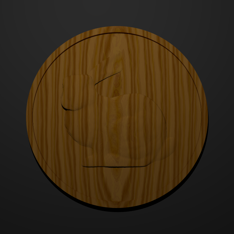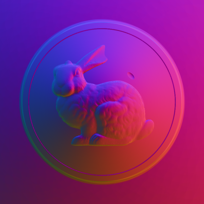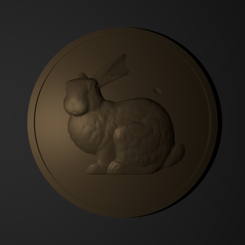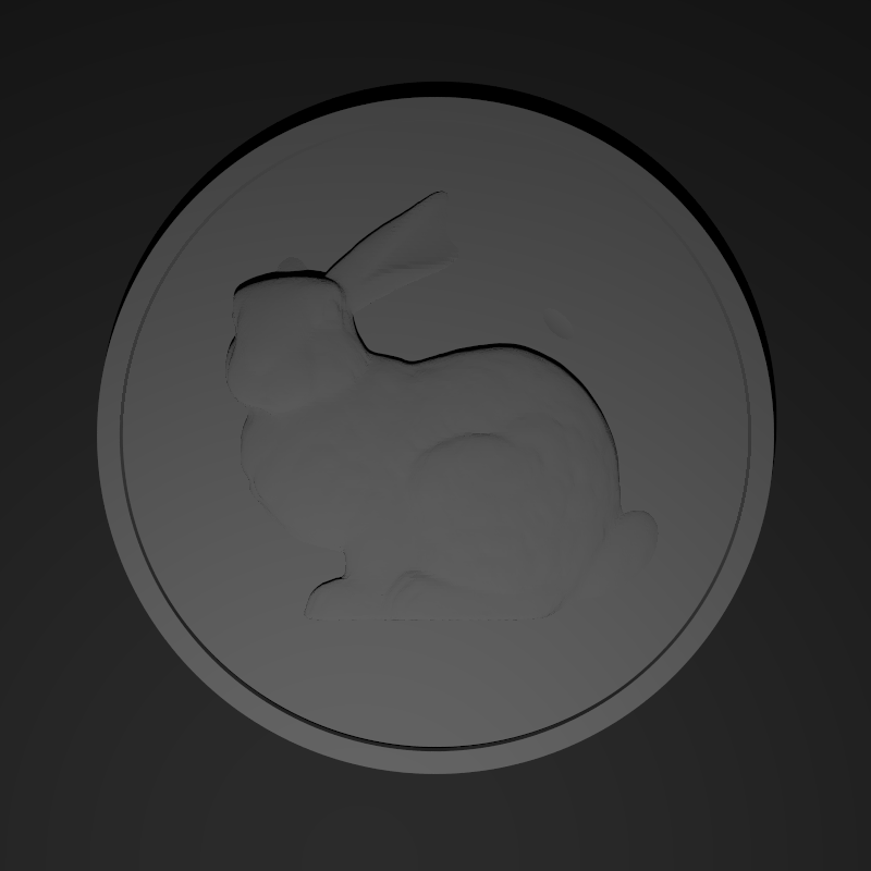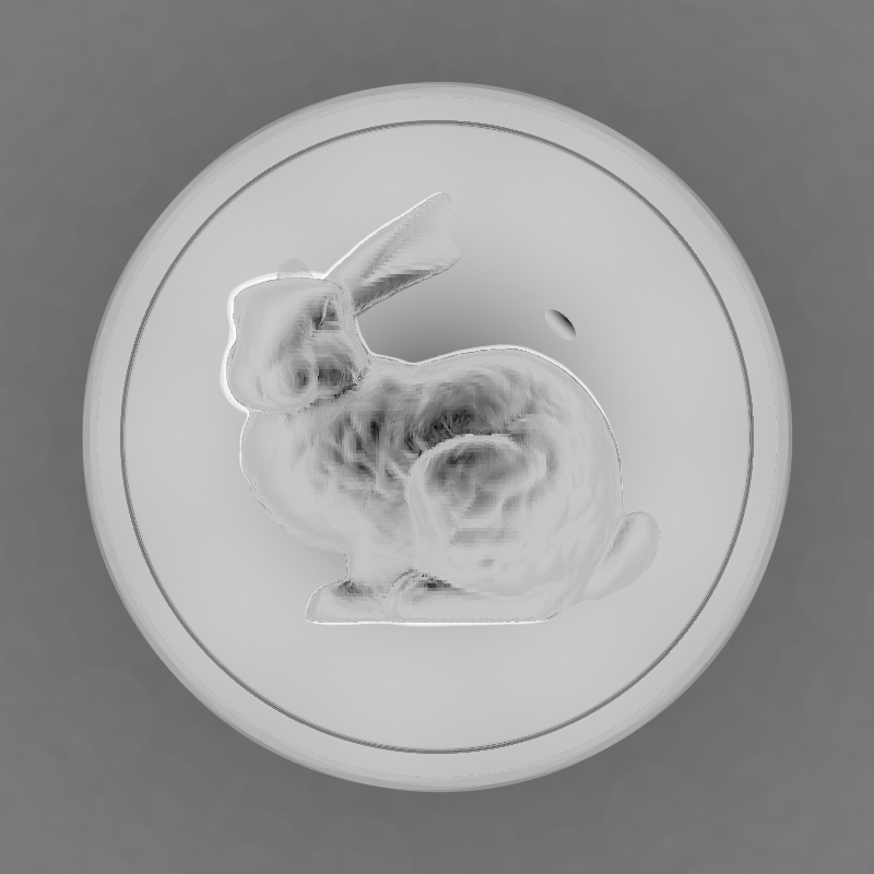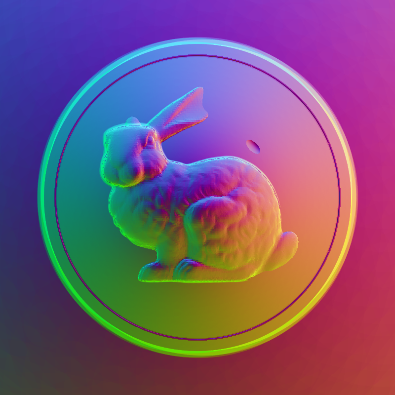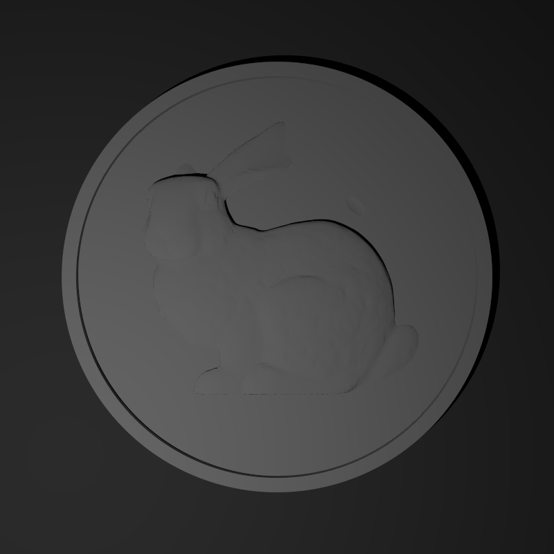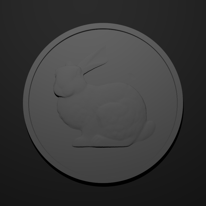 Let's see on some synthetic examples how photometric stereo performs for defect detection. Using again POV-Ray and the Stanford bunny, I've generated a dataset of "Bunny coins" with three textures: matte, metal and wood. The bunny is flatten to the extreme and a slight dent is made on the coin surface near its back.